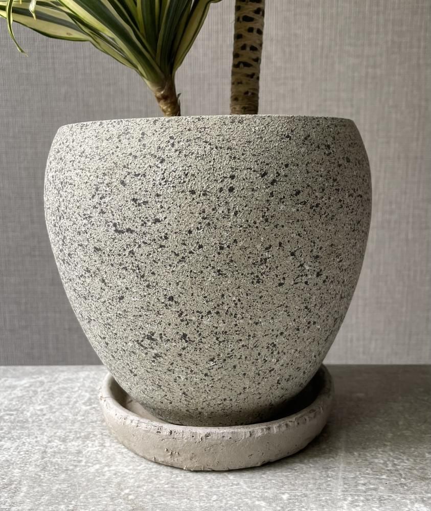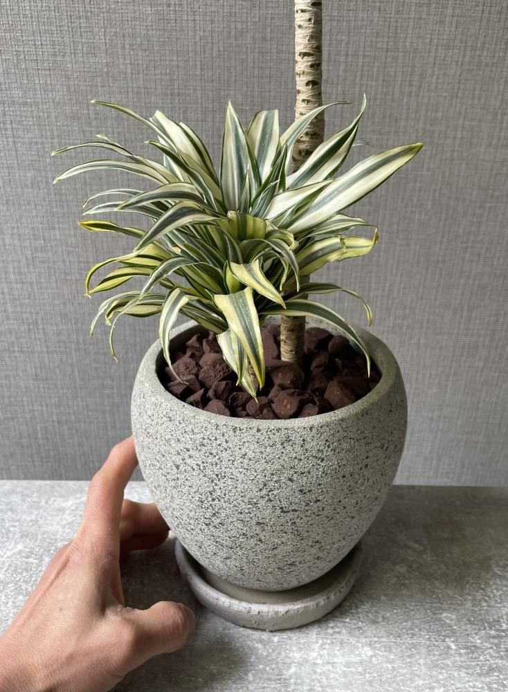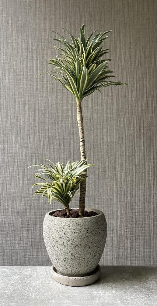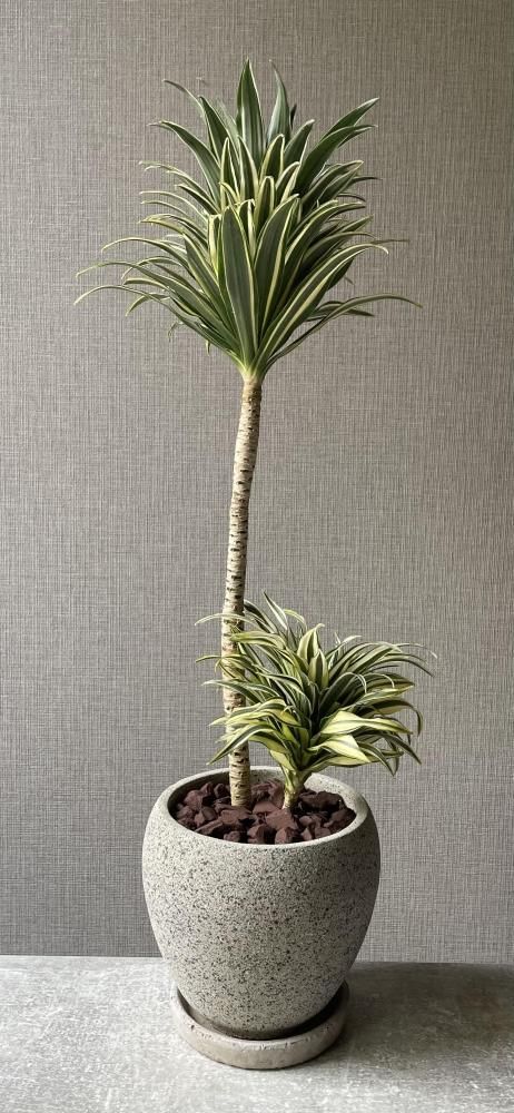 グレーの陶器鉢に植えられ、非常にスタイリッシュな仕上がりです。